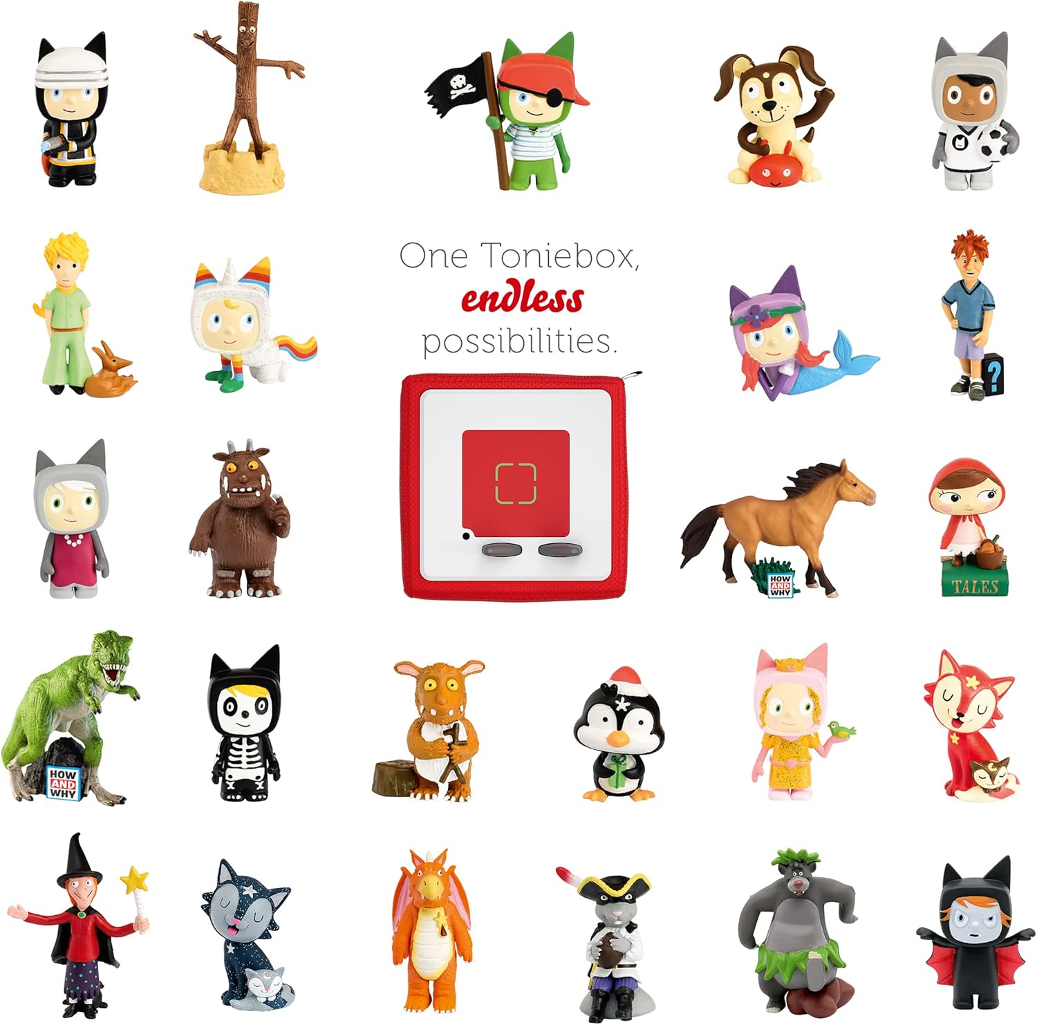 - Sem tela: Tonies são audiolivros, músicas e histórias que funcionam com um Toniebox, o inovador sistema reprodutor de música portátil que combina tocar, aprender e ouvir, e tudo sem tela