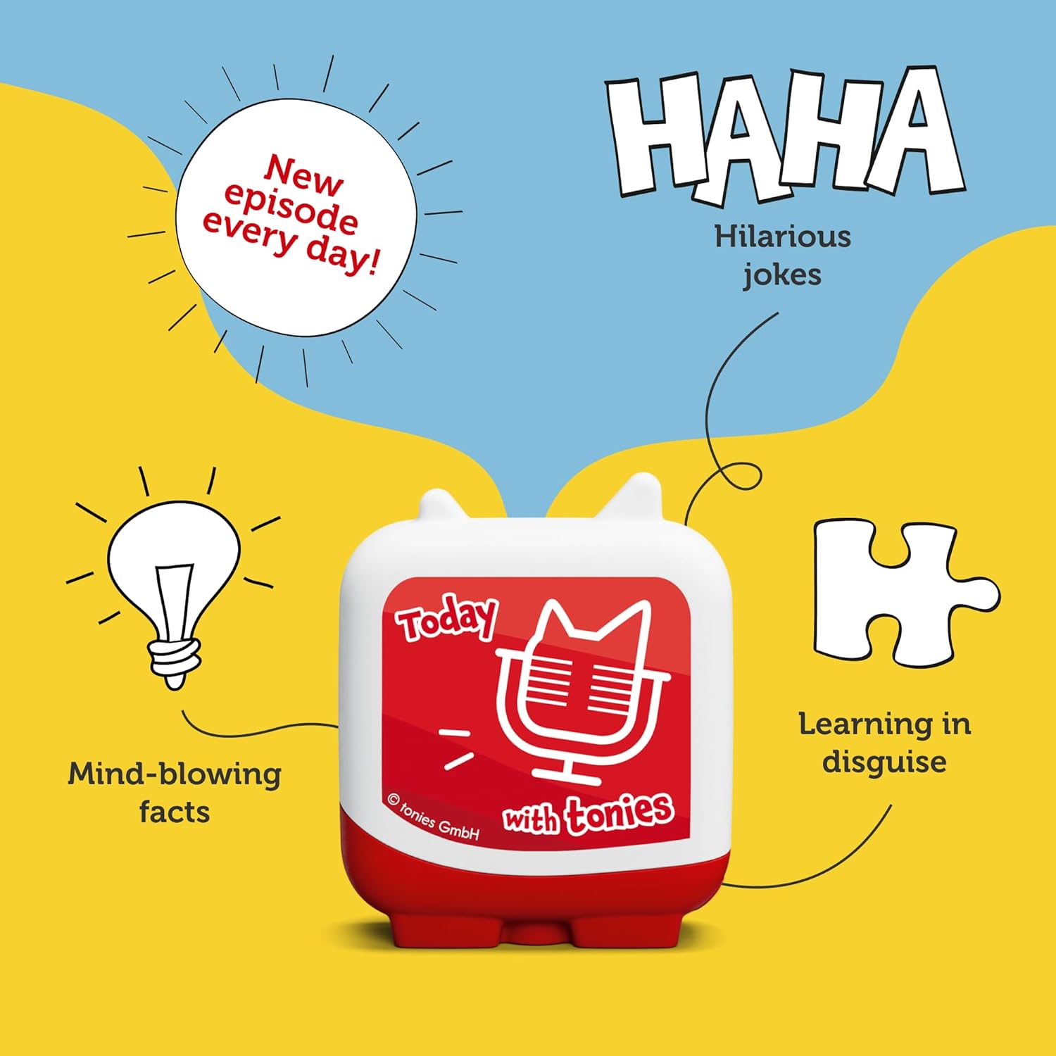 tonies Today com podcast tonies para crianças, diversão diária, piadas, fatos e desafios, novos conteúdos todos os dias, para maiores de 4 anos, para usar com Toniebox