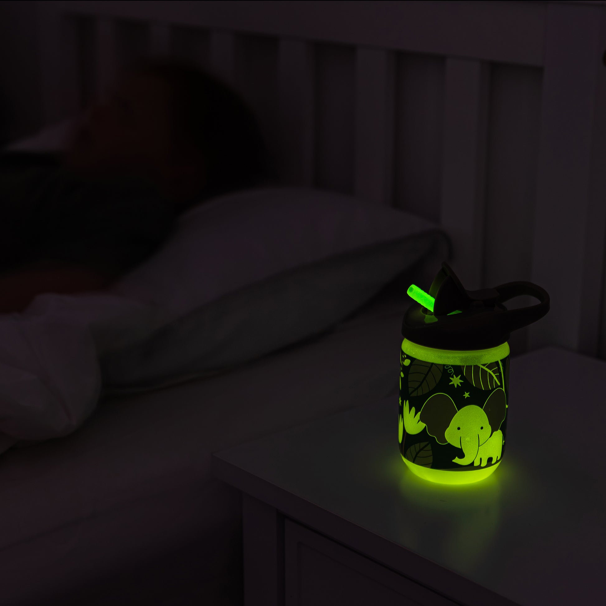 Na hora de dormir, quando as luzes se apagam, o copo e o canudo brilham no escuro, para que seu filho os encontre sem dificuldade.