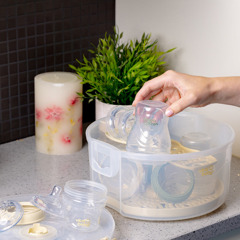 Para maior comodidade, a mamadeira é autoesterilizável — basta adicionar água e aquecer no micro-ondas por apenas três minutos para uma limpeza rápida e eficaz.