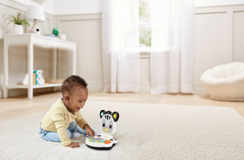 Galope para aprender com o laptop Discovery Zebra!Aprenda tudo sobre formas, cores, clima, letras e objetos pressionando os botões coloridos de formas.Pressione o teclado numérico para ouvir os números de 0 a 9 e uma música divertida será tocada para reforçar o aprendizado dos números. No modo música, ouça 10 melodias populares e pressione os botões para tocar sons divertidos.As cores contrastantes da Zebra e dois poppers de silicone proporcionam estimulação visual e tátil. Um rolo giratório e um mouse móvel aumentam o tempo de jogo e melhoram o desenvolvimento de habilidades motoras.Leve o laptop Discovery Zebra com você com sua alça de transporte bacana.