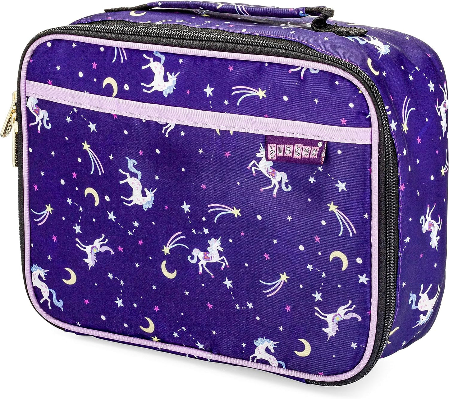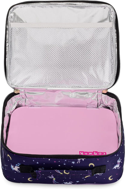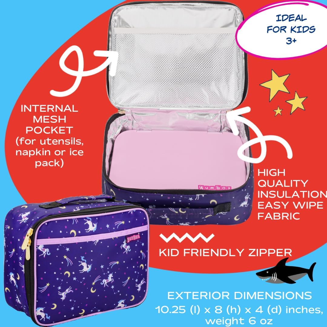 Fiambrera aislante Yumbox para niños: ligera y duradera; bolsillos exteriores/interiores; 10,25x8x4 pulgadas; Fácil limpieza; Fiambrera perfecta para niñas; Estampado de unicornio morado