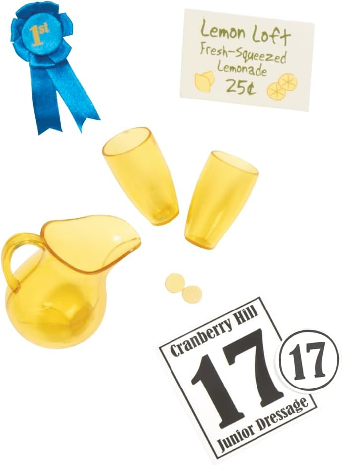 - Inclui: boneca, 2 roupas completas, capacete, número de montaria, faixa de prémio, 2 copos, jarra, 2 rodelas de limão e um poster de limonada.