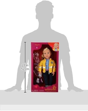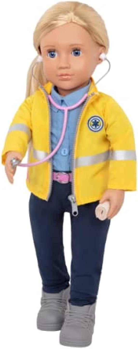 - Boneca paramédica Kaylin, de 46 cm, com olhos azuis adormecidos e longos cabelos loiros.
