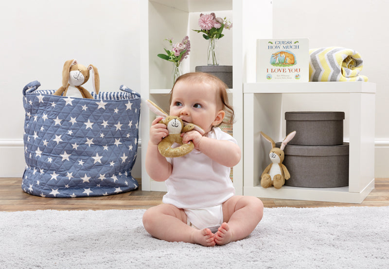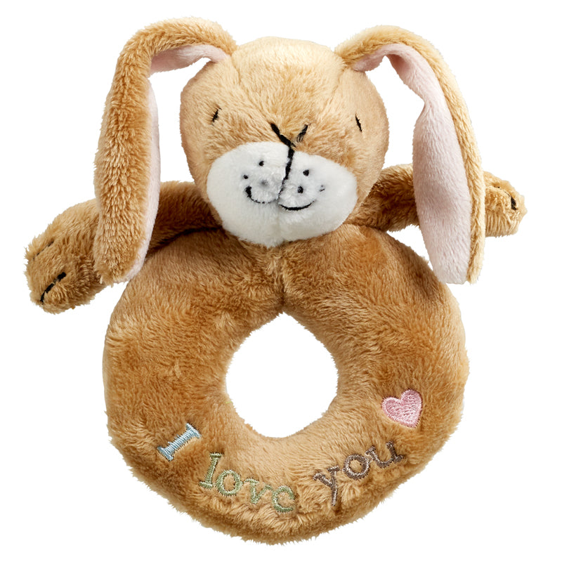 Os anéis cobertos de pelúcia são do tamanho perfeito para mãos pequenas apertarem e apertarem, e são decorados com as palavras bordadas 'I Love You' seguidas de um coração. Coberto com a clássica semelhança de ursinho da pequena lebre castanha, seus braços, orelhas compridas e características faciais também fornecem muita exploração tátil, incentivando o desenvolvimento sensorial. Os sentidos auditivos dos pequenos são recompensados com sons suaves de chocalho, pois suas habilidades motoras induzem causa e efeito.
