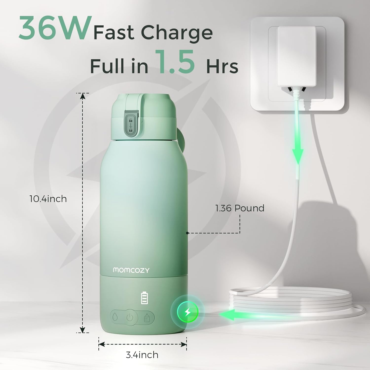 Momcozy Aquecedor de Leite Portátil para Viagem – Modos Duplos de Aquecimento para Leite Materno e Água, Aquecedor de Mamadeira Portátil com Aquecimento Rápido, Bateria de Longa Duração, Capacidade de 500 ml e Recarga USB-C para Casa, Carro e Passeios