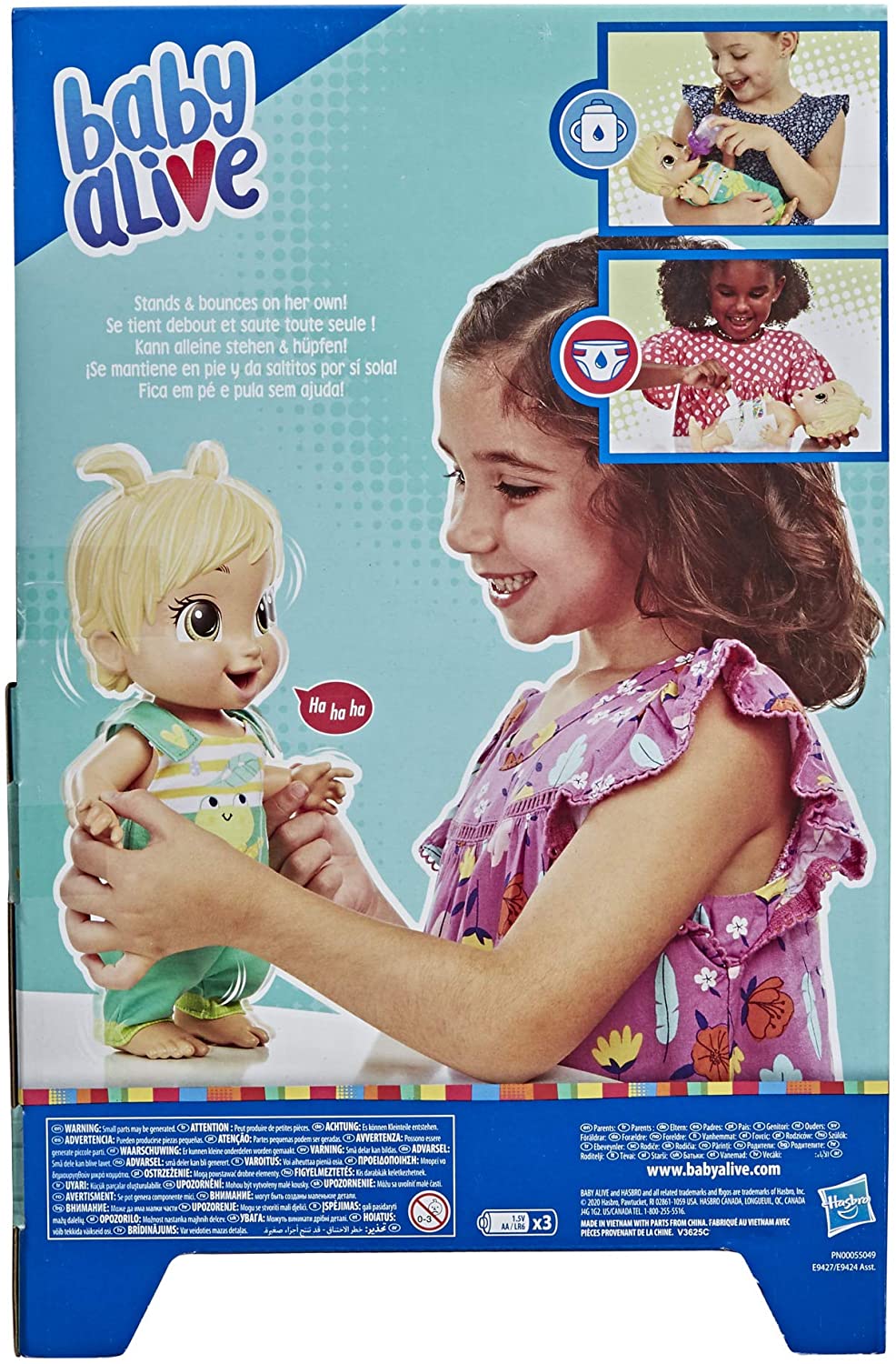 Ela salta e ri: A boneca Baby Alive Baby Gotta Bounce vai pular com risadas contagiantes quando você aperta o pulso dela ou acena repetidamente ou se move na frente dela!