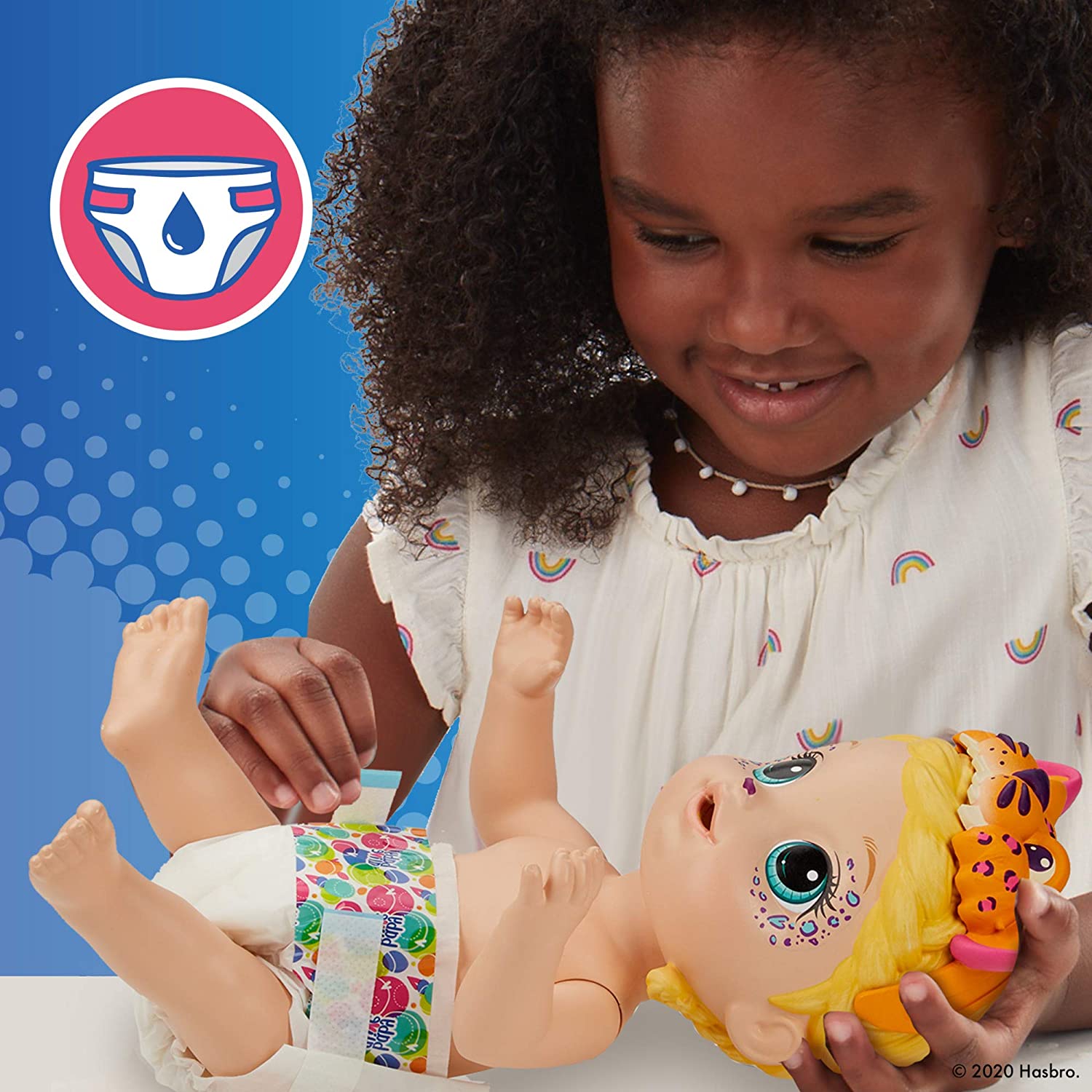 BONECA QUE BEBE E FAZ XIXI: Depois que ela bebe, este gatinho vai precisar de uma fralda! Isso porque esta boneca Baby Alive Rainbow Wildcats "faz xixi", como um bebê! (Fraldas adicionais vendidas separadamente.)
