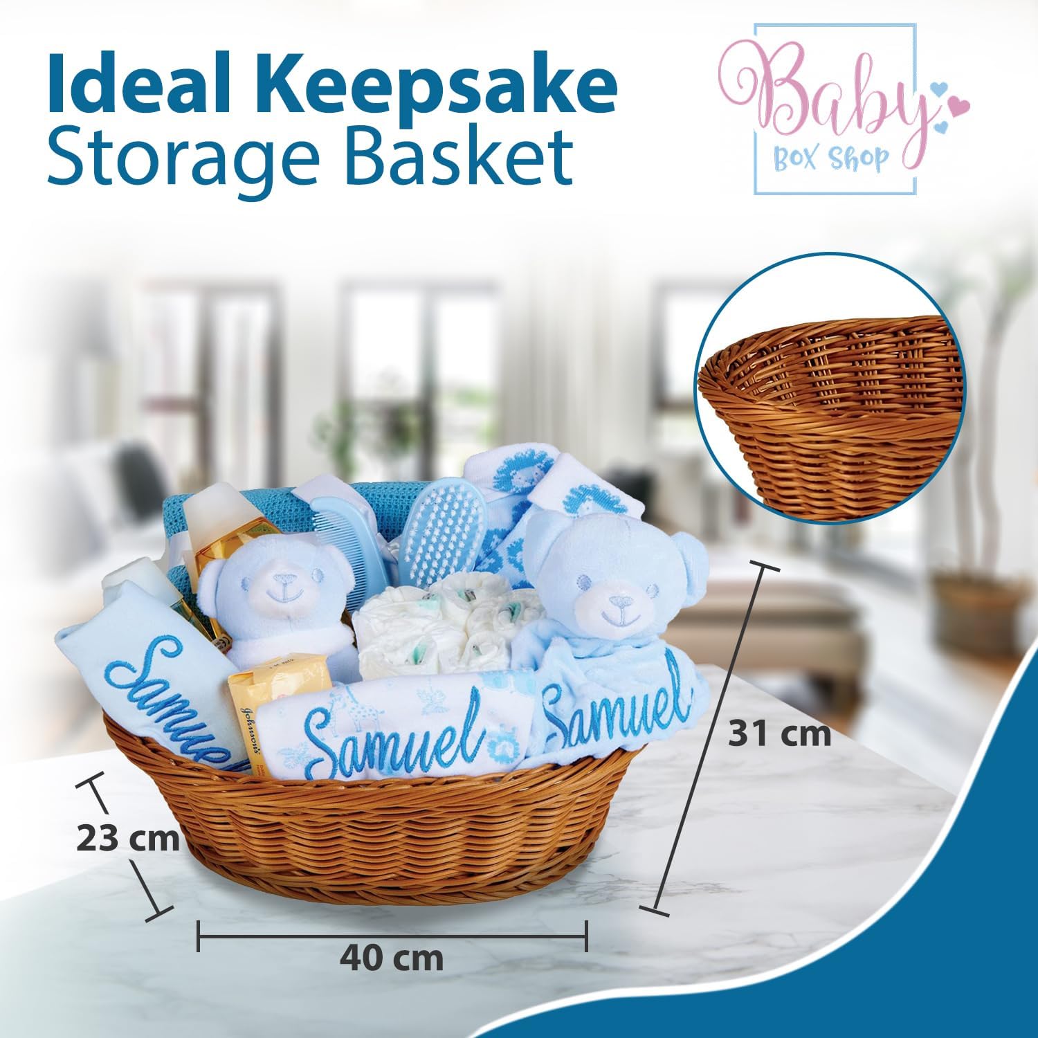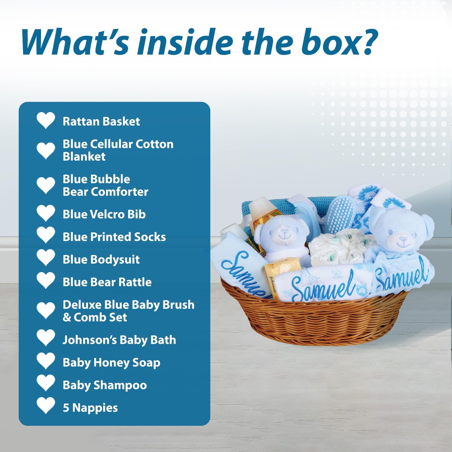 - Value for Money: Our baby boy gift box includes a storage basket, soft bodysuit, bib, Johnson’s products, 3 nappies, and a sensory teddy bear comforter. Complete with a matching rattle and a classic blue cotton blanket, all tied with a satin ribbon. NOTE: This hamper no longer contains soap