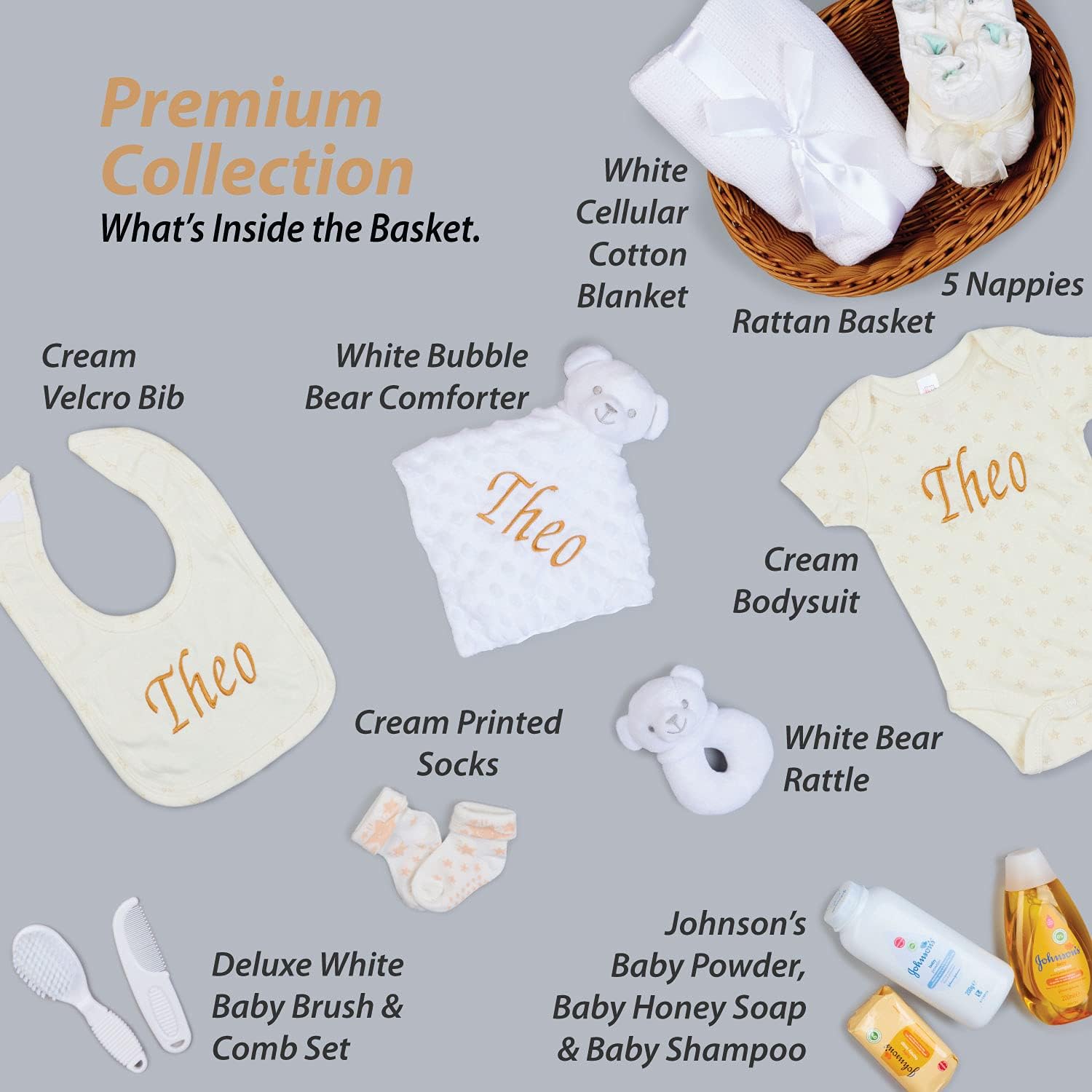 - What's in the Basket: This baby hamper features 3 personalized items, a cotton blanket, brush & comb set, 3 nappies, printed socks, a bear rattle, bath essentials, a basket wrapped in chiffon/organza. Clothes are size 3-6 months. NOTE: This hamper no longer contains soap