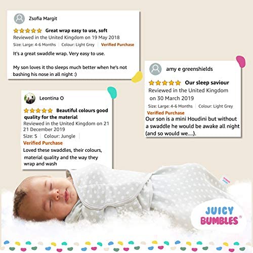 👌 MAIS DE 2500 AVALIAÇÕES HONESTAS - nossos Swaddles têm mais de 2500 avaliações honestas de CLIENTES REAIS FELIZES! O feedback mais comum que temos é a facilidade de uso e a excelente qualidade deles! Amamos todos os nossos clientes e mal podemos esperar para recebê-lo! Você não está apenas comprando produtos britânicos e apoiando uma empresa local no Reino Unido, mas também entrando para a família Juicy Bumbles.