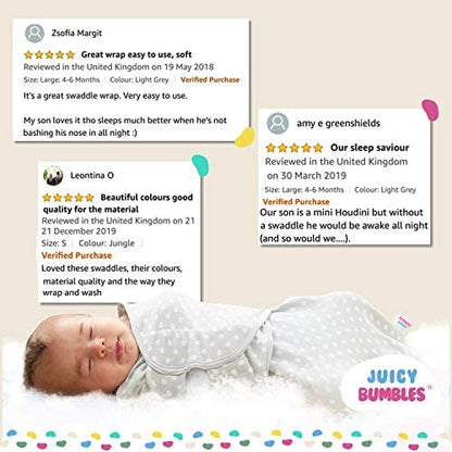 💤 UM SONO MAIS SEGURO PARA O BEBÊ - UMA NOITE GRATUITA PARA VOCÊ. Os envoltórios do Juicy Bumbles eliminam os perigos comprovados causados por roupas de cama soltas, mantendo seu filho confortável. Nossos Swaddles também garantem que o bebê durma de costas. Esses são os 2 métodos pediátricos recomendados para um sono seguro. Nossos Swaddles também são testados em laboratório de forma independente e passam nos mais rigorosos testes de segurança.