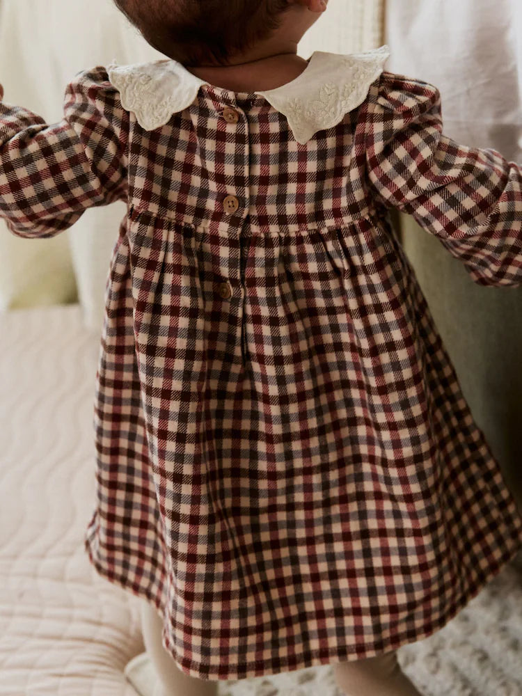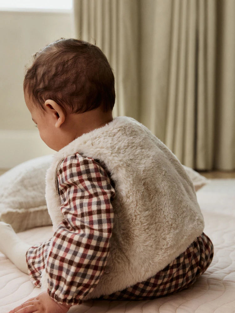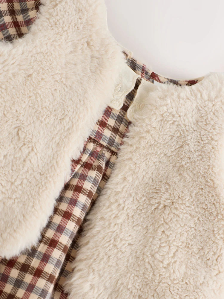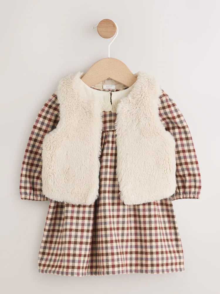 |BabyGirl| Conjunto De 2 Peças De Vestido e Colete Xadrez Bege/Creme Para Bebê (0 meses a 2 anos)