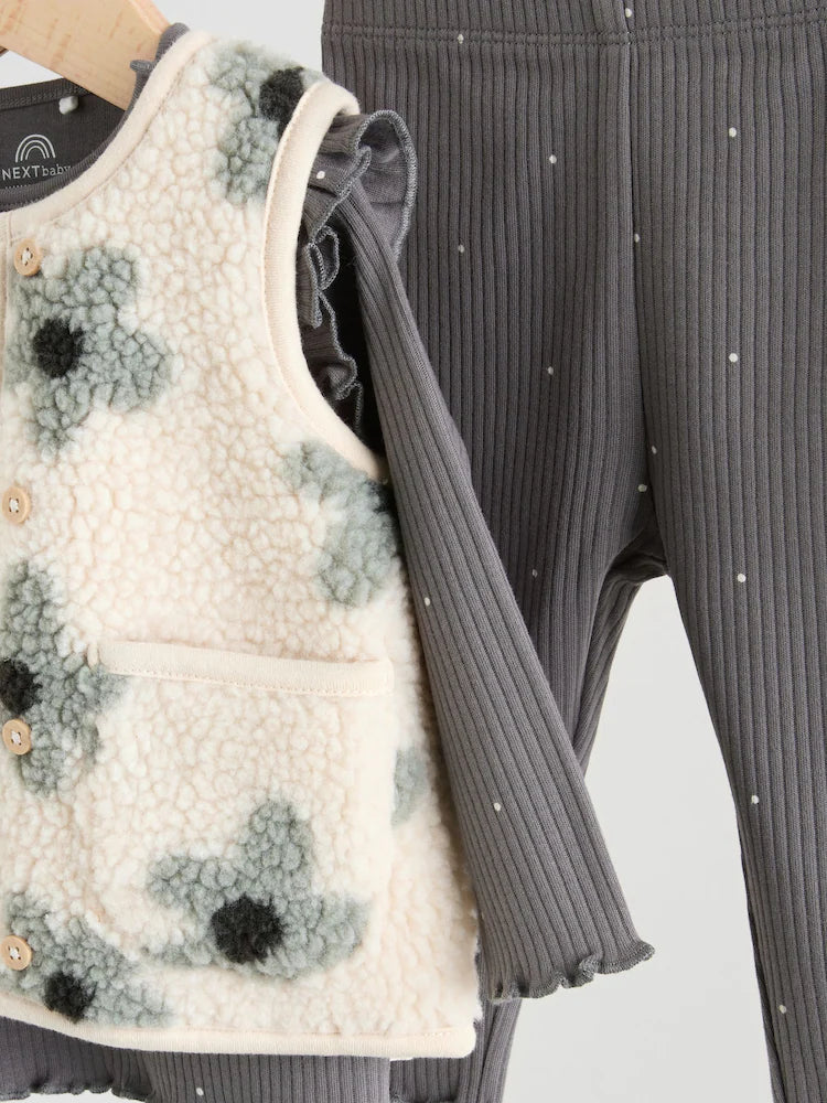 |BabyGirl| Conjunto De 3 Peças De Blusa e Leggings De Manga Comprida Com Colete Floral Cinza para bebê (0 meses a 2 anos)