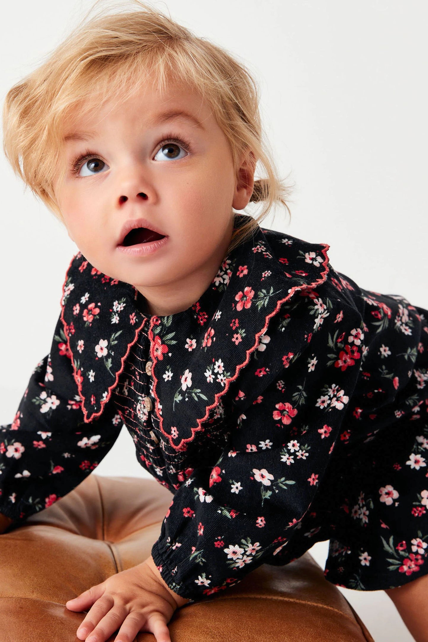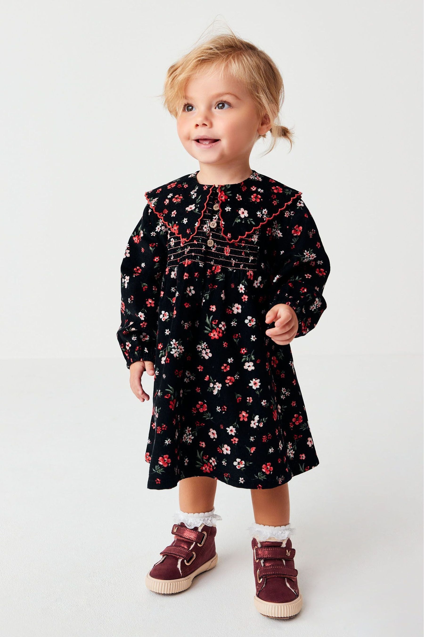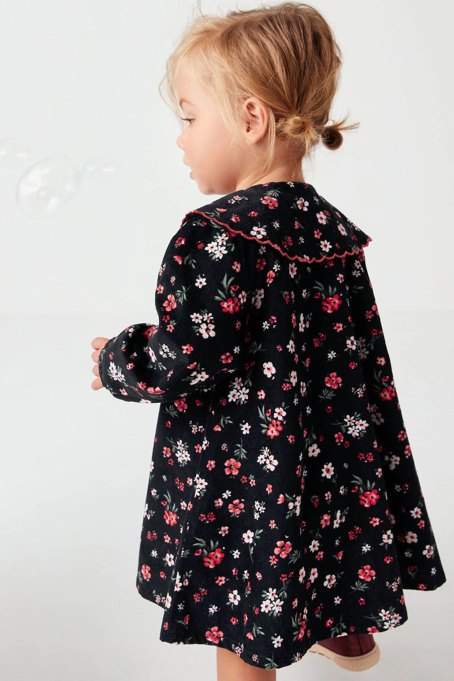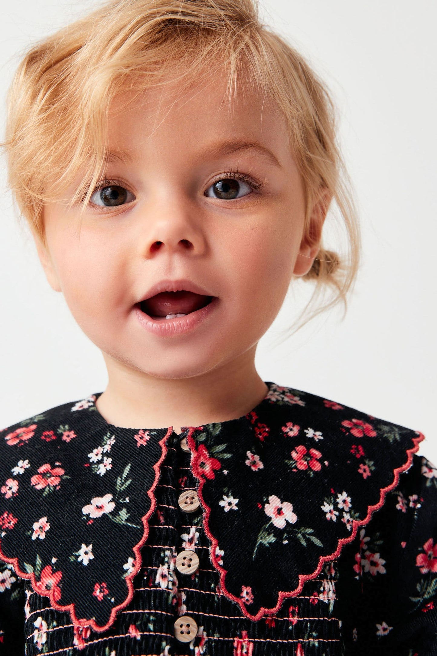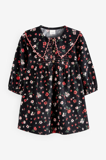 |BabyGirl| Vestido com Gola de Cordão Franzido Floral - Preto (3meses-7anos)