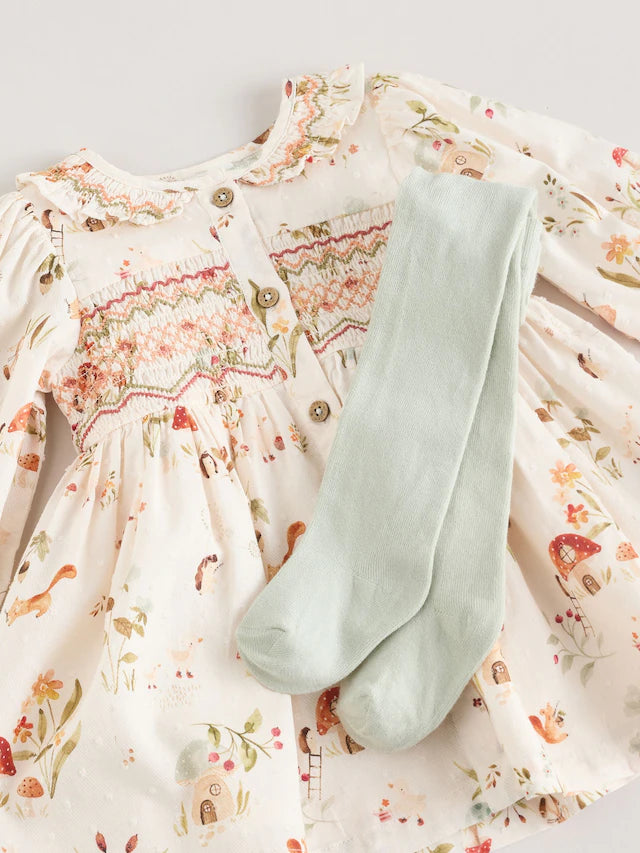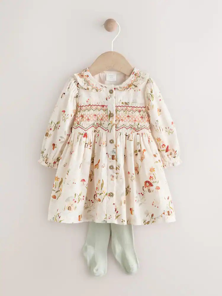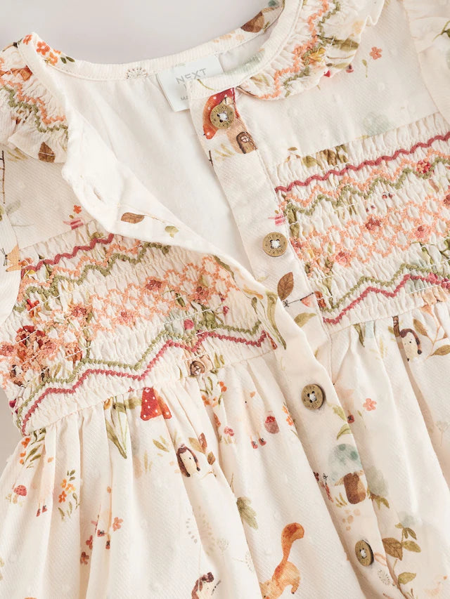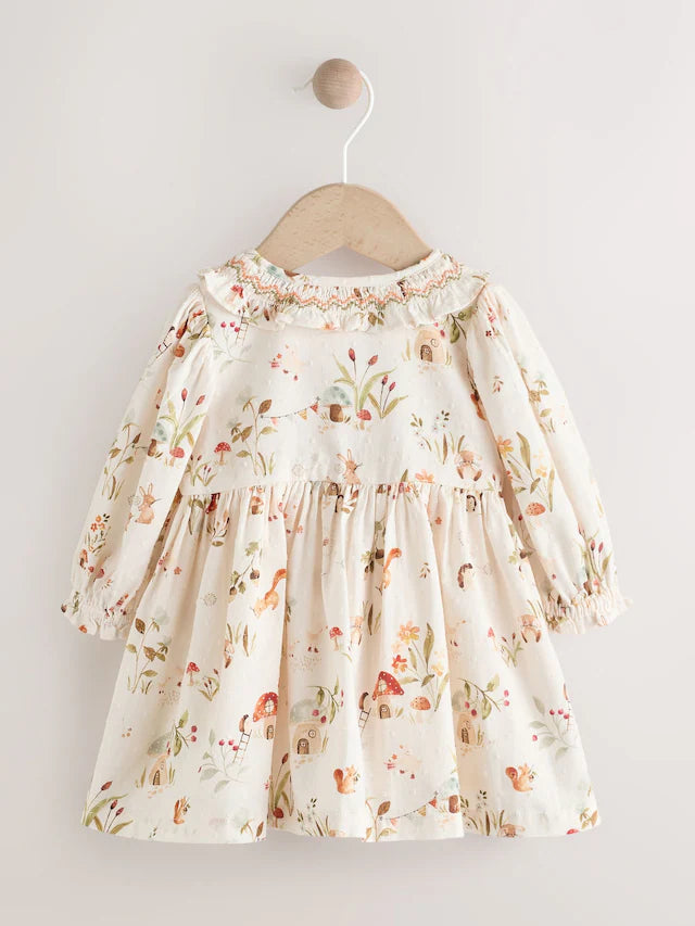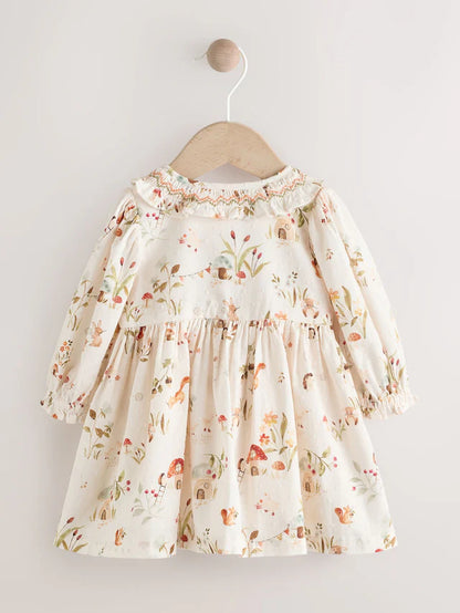 |BabyGirl| Vestido De Bebê Com Estampa Floral Creme e Gola De Personagem (0-18 meses)