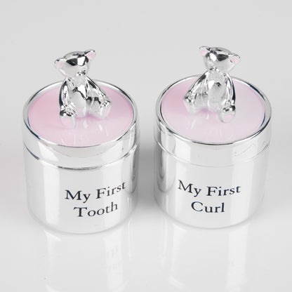 Dê um presente para guardar para sempre com este belo conjunto de caixa de primeiro dente e cacho folheado a prata e laqueado rosa. Acabamento em ursinho de pelúcia e apresentado em caixa de presente forrada de cetim. Uma celebração e dedicação maravilhosas da vida e do futuro do bebê devem ser combinadas com uma coleção atemporal de belas lembranças para guardar e lembrar.