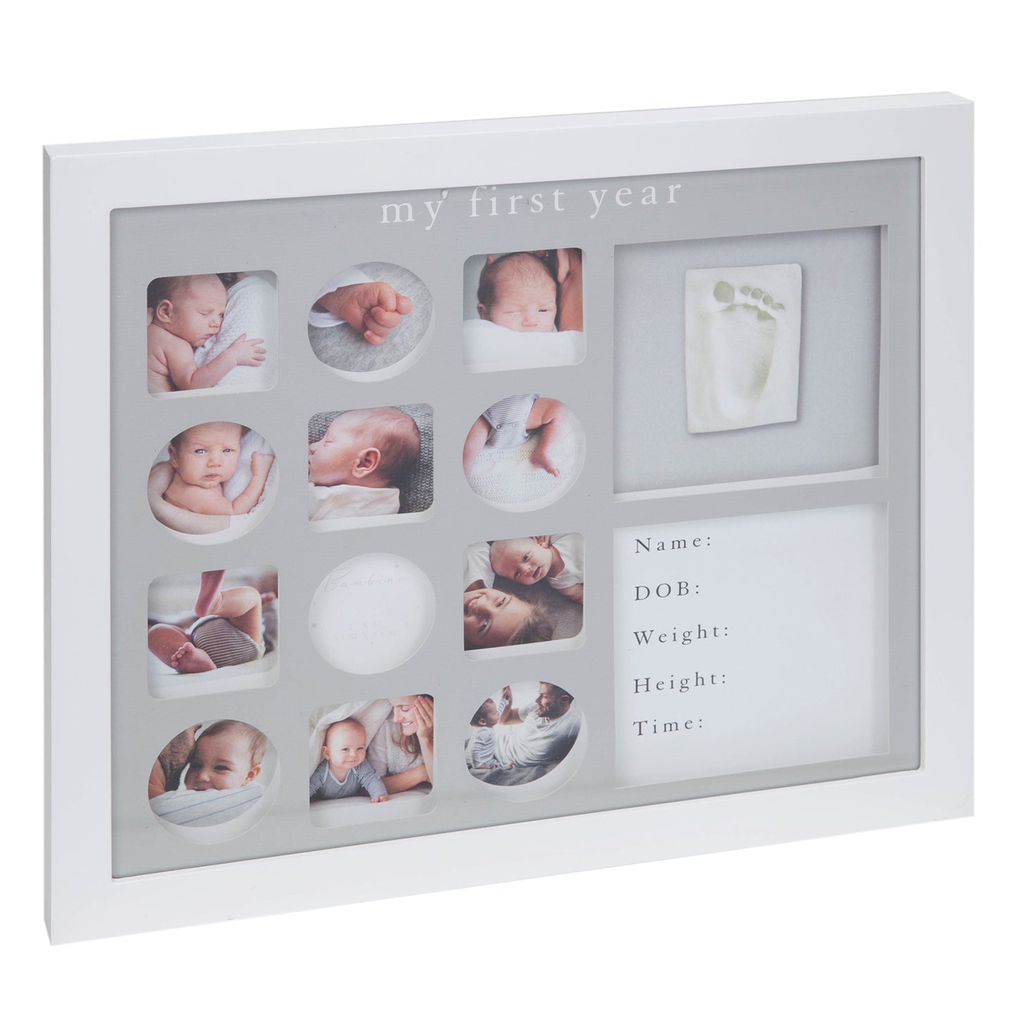 Mantenha um registro precioso desses primeiros 12 meses com esta bela moldura de colagem MY PRIMEIRO ANO com kit de impressão de argila e gráfico de dados. Da BAMBINO BY JULIANA® - abrindo novos olhos para um mundo de maravilhas. O novo presente perfeito para bebês.