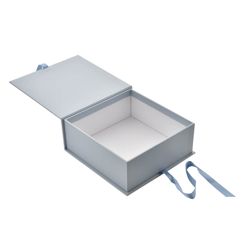 - A caixa abre na parte superior e é decorada com uma fita combinando