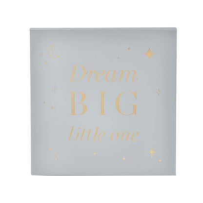 O papelão apresenta um acabamento azul, aprimorado por detalhes dourados, incluindo o texto 'Dream big little one'.