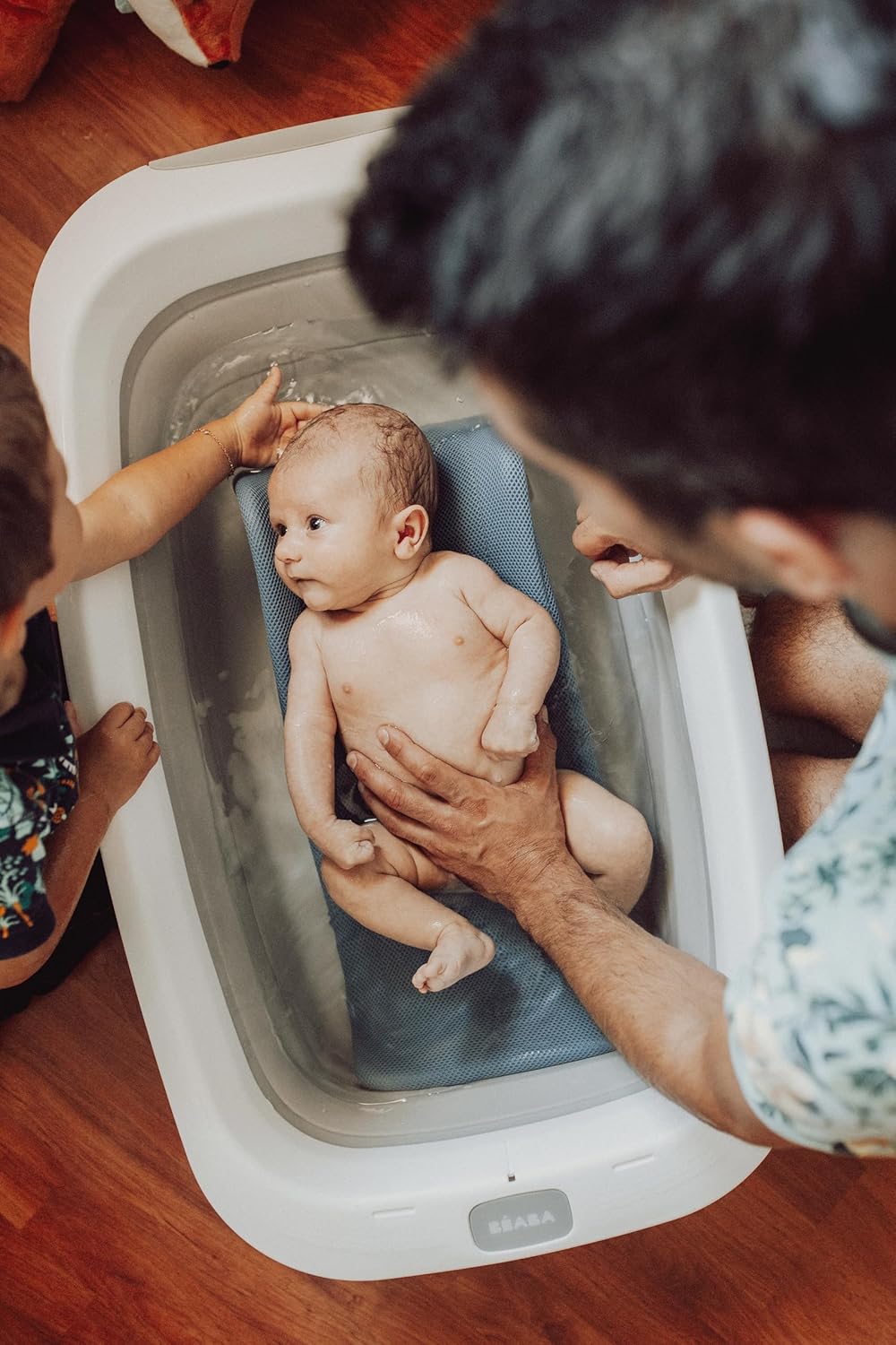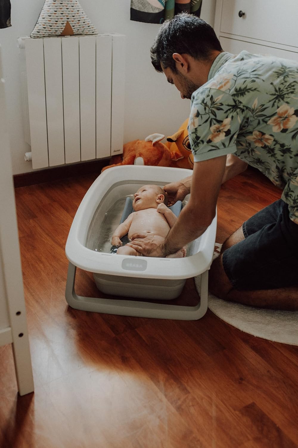 Banheira dobrável para bebê Béaba, ultra compacta, pés antiderrapantes, design moderno, tampão de drenagem, armazenamento prático, espaço mínimo necessário, fácil de usar, Eazy Pop Camélé'O, 29L, cinza
