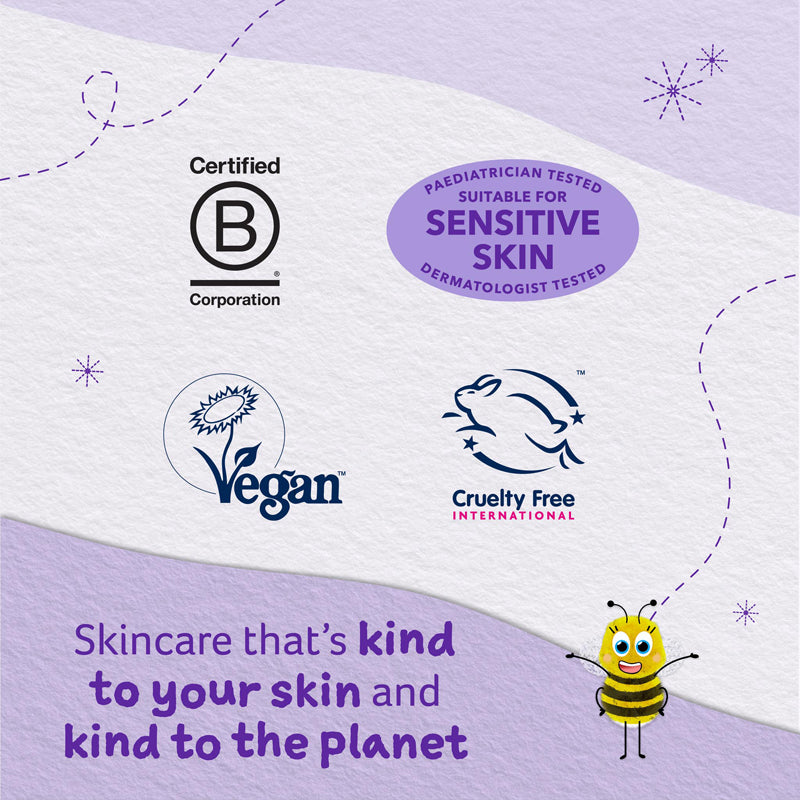 As bolhas de longa duração proporcionam uma sensação sedosa na pele delicada, enquanto os limpadores naturais agem, limpando suavemente a pele e deixando-a hidratada. A fórmula nutritiva foi aprovada por dermatologistas e pediatras e proporciona hidratação clinicamente comprovada por 12 horas, deixando a pele do seu pequeno nutrida.