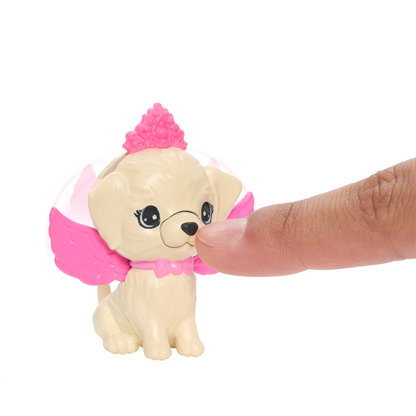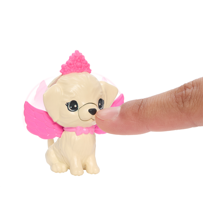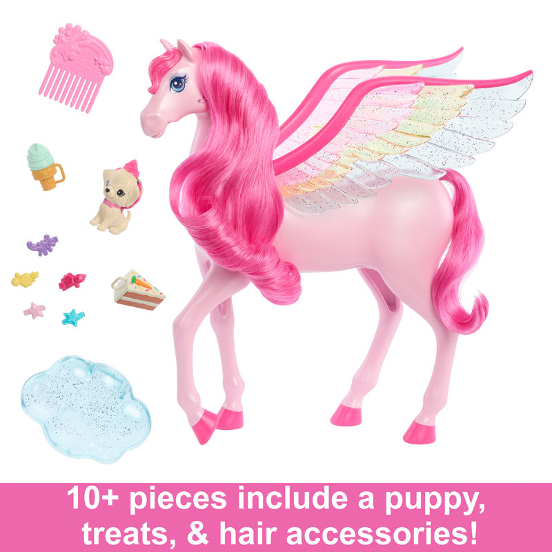 - O pégaso apresenta luzes e sons de arco-íris ativados de várias maneiras. Ela também vem com um cachorrinho mágico e acessórios fofos!