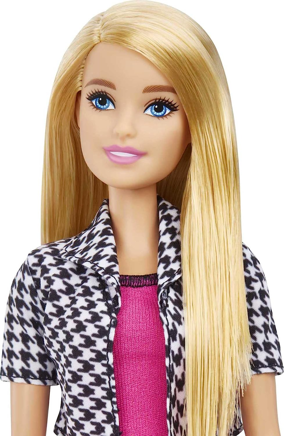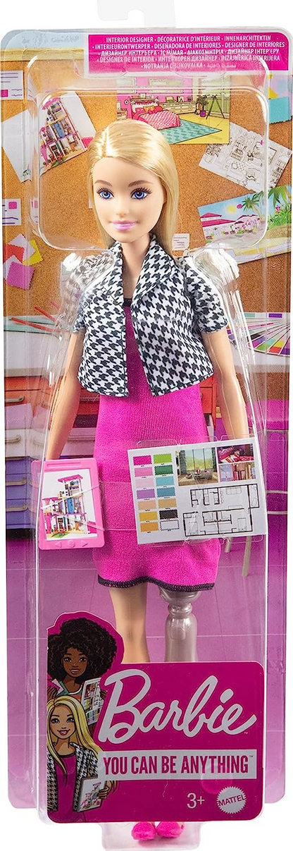- Vestindo um vestido rosa e uma jaqueta houndstooth cortada, além de sapatilhas rosa combinando, a boneca Barbie Designer de Interiores está pronta para projetar interiores!