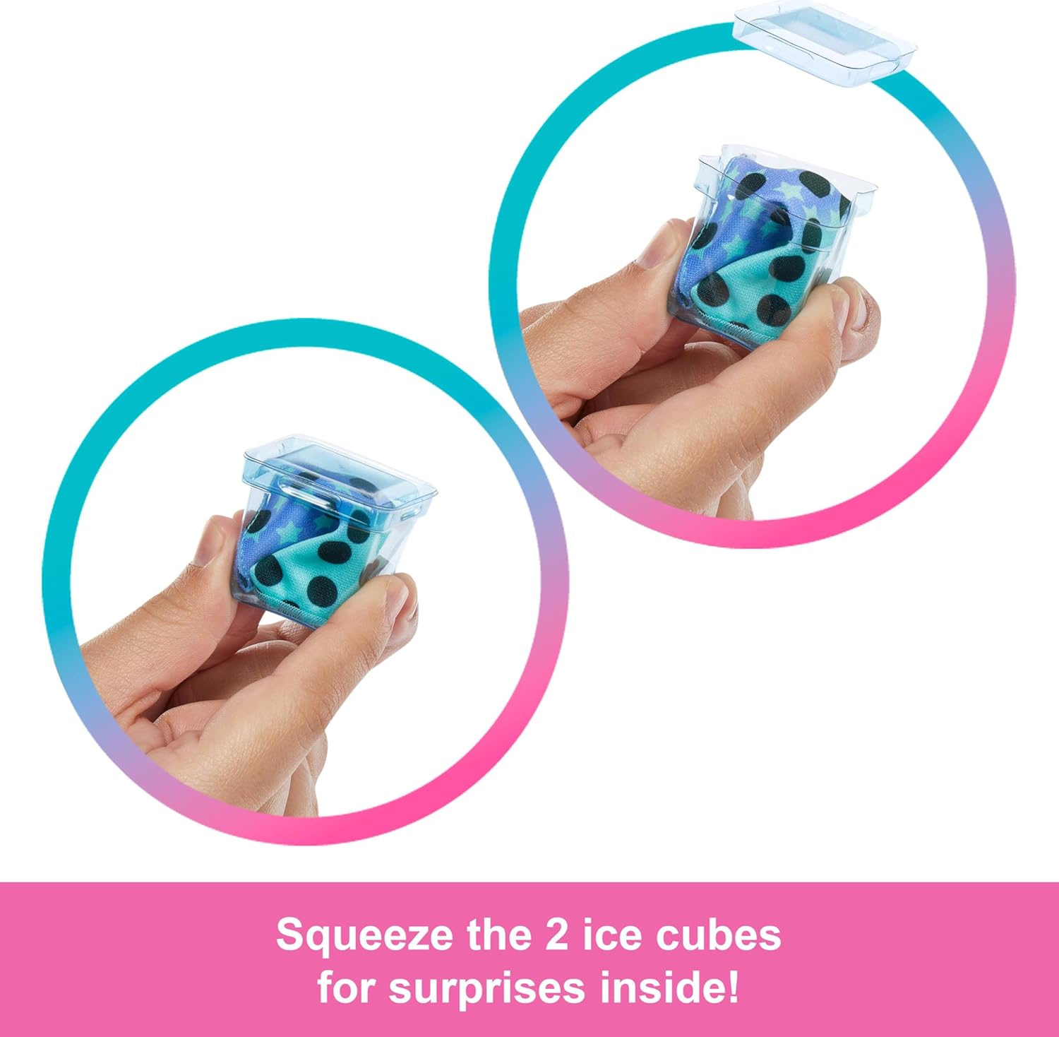 - Encontre os 2 cubos de gelo que se abrem para revelar outra surpresa dentro — uma saia colorida e um lindo par de sapatos. Use os cubos de gelo para armazenamento ou para revelar novamente!