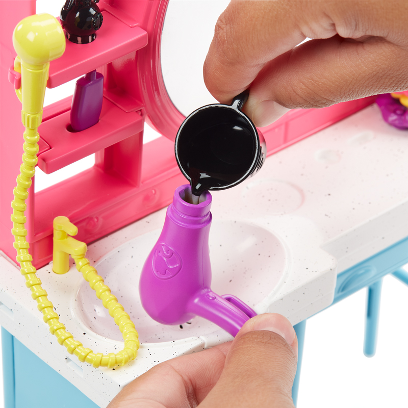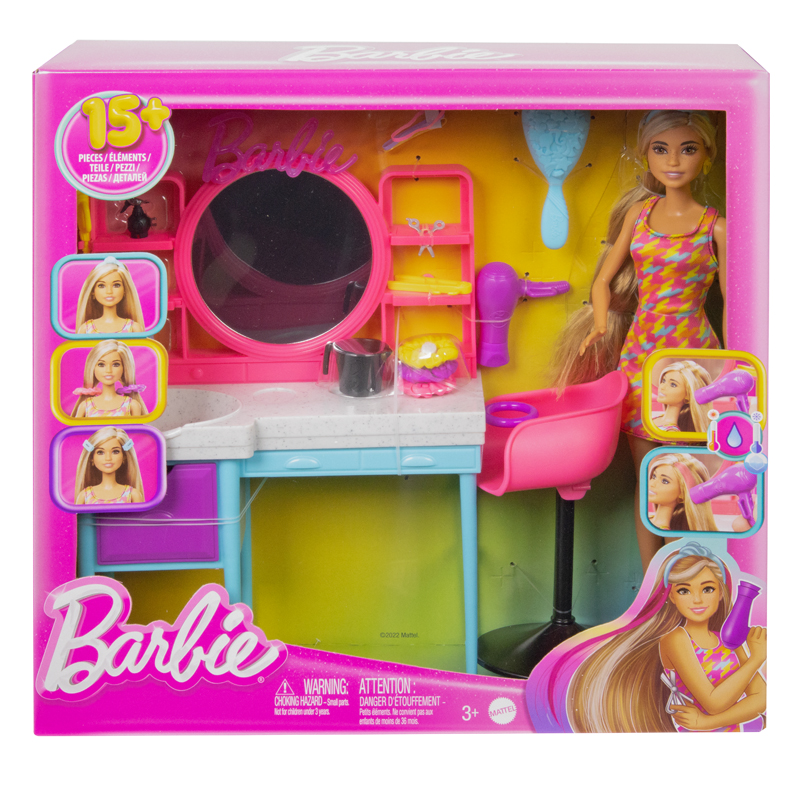 - Este playset Barbie Totally Hair inspira narrativas criativas e dramatizações com uma penteadeira, mais de 15 acessórios e uma boneca com 6 polegadas de cabelo longo e jogável que muda de cor.