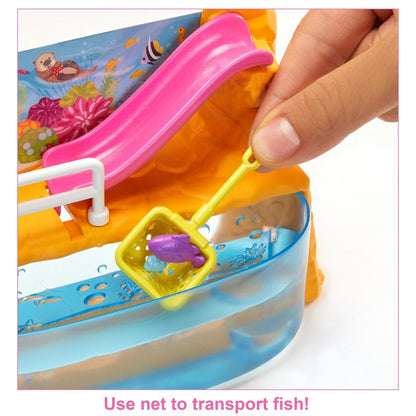 As imaginações podem se espalhar durante a brincadeira com esta boneca Chelsea e seu playset de aquário! Um arco em forma de rocha e gráficos com temas do mar definem o cenário para um dia no aquário, e peças de animais marinhos inspiram histórias. Envie a lontra para baixo do escorregador ou encha o tanque com água para criar um lar para três pedaços de criaturas marinhas e use a rede para transportá-los com segurança. A boneca Chelsea está pronta para explorar em uma blusa com gráficos inspirados no mar, uma saia rosa cintilante e sapatos casuais.