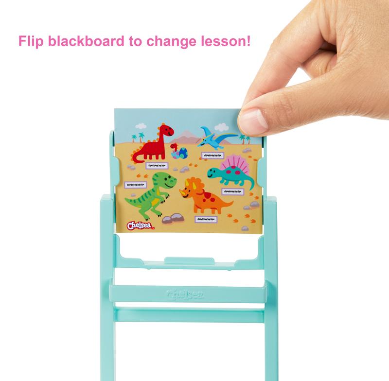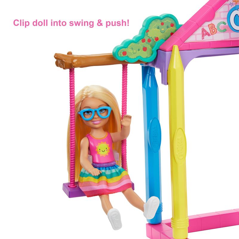 Este playset da Barbie Club Chelsea School é o lugar perfeito para jovens mentes explorarem a sala de aula e além! Decorações doces na escola, acessórios para contar histórias e várias áreas de recreação inspiram diversão imaginativa. Quando a aula estiver em sessão, acomode uma boneca Chelsea e um amigo (vendido separadamente) nos dois conjuntos de mesa e cadeira. Um acessório do quadro-negro incentiva a narrativa: vire-o para frente e para trás para alternar entre os assuntos. Quando for a hora do recreio, mande a boneca Chelsea para baixo do escorregador ou prenda-a no balanço e empurre! Não se esqueça de parar na lanchonete para um lanche - um balcão de almoço, bandejas e uma caixa registradora contribuem para a diversão das histórias.