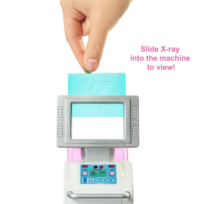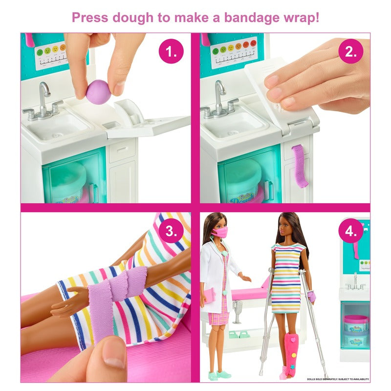 A clínica inclui uma boneca médica Barbie morena (30,40 cm) e 4 áreas de lazer: posto médico, mesa de exame, máquina de raio-X e loja de presentes. As crianças podem fazer moldes para sua boneca "paciente" (vendida separadamente) com um recurso de confecção de gesso realista (use massa rosa, roxa ou branca) para criar moldes para os braços e pernas do paciente e criar bandagens com o curativo. Playset também inclui mais de 30 peças para jogar a diversão: 3 recipientes de massa, elenco de perna, elenco de braço de Chelsea, um conjunto de muletas, adesivos, raios-X, itens de loja de presentes e muito mais.