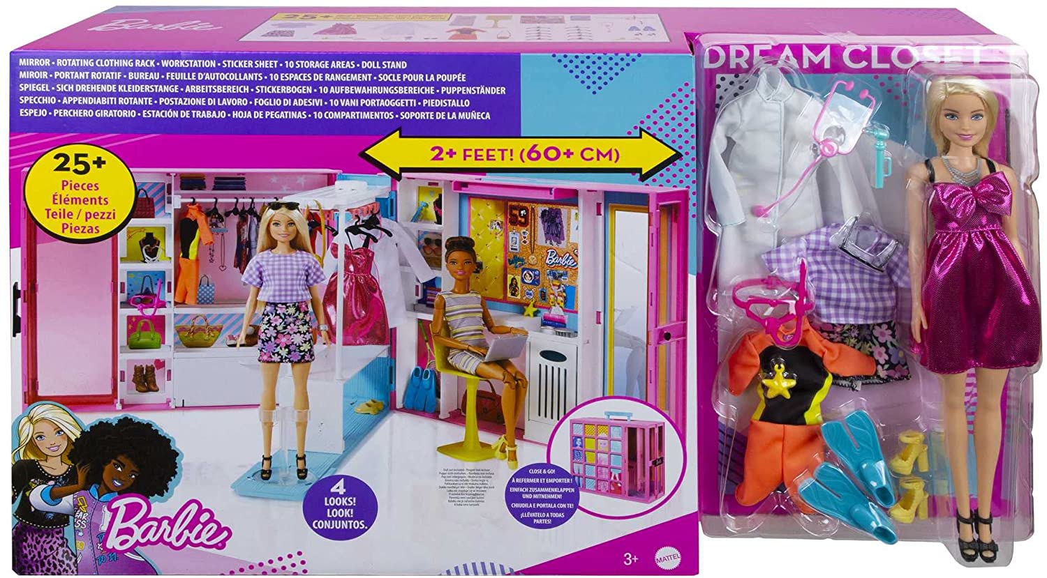 CRIE LOOKS E HISTÓRIAS INFINITAS PARA ACOMPANHAR ELES. O armário se abre para revelar um playset de 2 pés de largura com mais de 10 áreas de armazenamento e mais de 25 acessórios para vestir a Barbie para qualquer ocasião