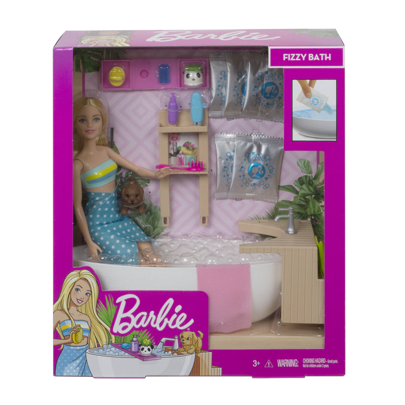 Basta encher a banheira com água, colocar a boneca Barbie dentro e adicionar um dos cinco pacotes de efervescentes brilhantes incluídos para ver a bolha de água, como em um spa real! A boneca Barbie pode relaxar com acessórios que incluem uma bandeja de banheira, produtos de banho, uma bucha, uma escova traseira e uma toalha. O spa também é relaxante, com uma moldura de madeira completa com uma floreira de panda. Há muito espaço para o filhote se sentar, além de pontos para guardar os acessórios. Algumas peças têm uma alça que a boneca pode segurar para incentivar a diversão com uma encenação. A boneca Barbie veste um maiô com uma toalha envolvente e apresenta flexibilidade extra para poses realistas e brincadeiras ativas.