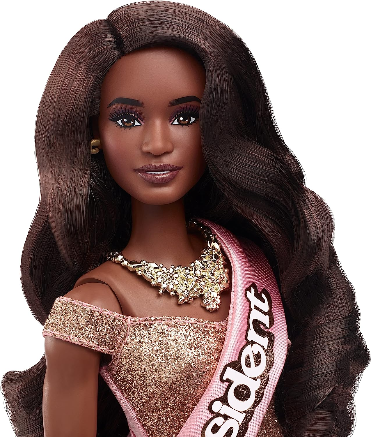 - Uma faixa presidencial com uma borla dourada adiciona um toque final ao seu visual imponente. Ela está pronta para liderar a Barbie Land com graça e estilo!