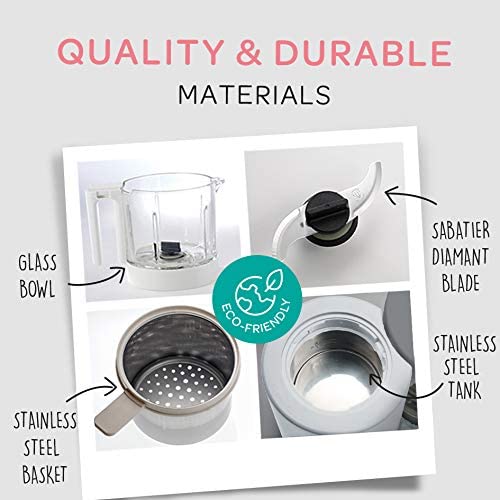 O fabricante de alimentos 4 em 1 da nova geração cozinha a vapor, mistura, descongela e reaquece Tigela de vidro de grande capacidade e cesto de aço inoxidável - para preservar o valor nutricional dos alimentos para bebês O vapor cozinha rapidamente em apenas 15 minutos, usando quantidade mínima de CO2, energia e água Lâmina de aço inoxidável de duplo nível para textura uniforme de alimentos Disponível em azul noturno ou cinza / brancos