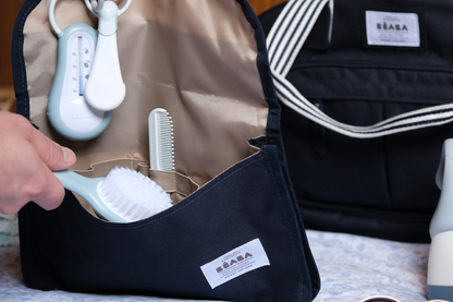O lindo conjunto de cuidados da BÉABA® inclui os itens essenciais necessários para um novo bebê: pente, escova, cortador de unhas e termômetro.