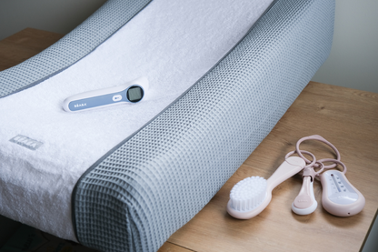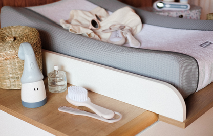 O lindo conjunto de cuidados da BÉABA® inclui os itens essenciais necessários para um novo bebê: pente, escova, cortador de unhas e termômetro.