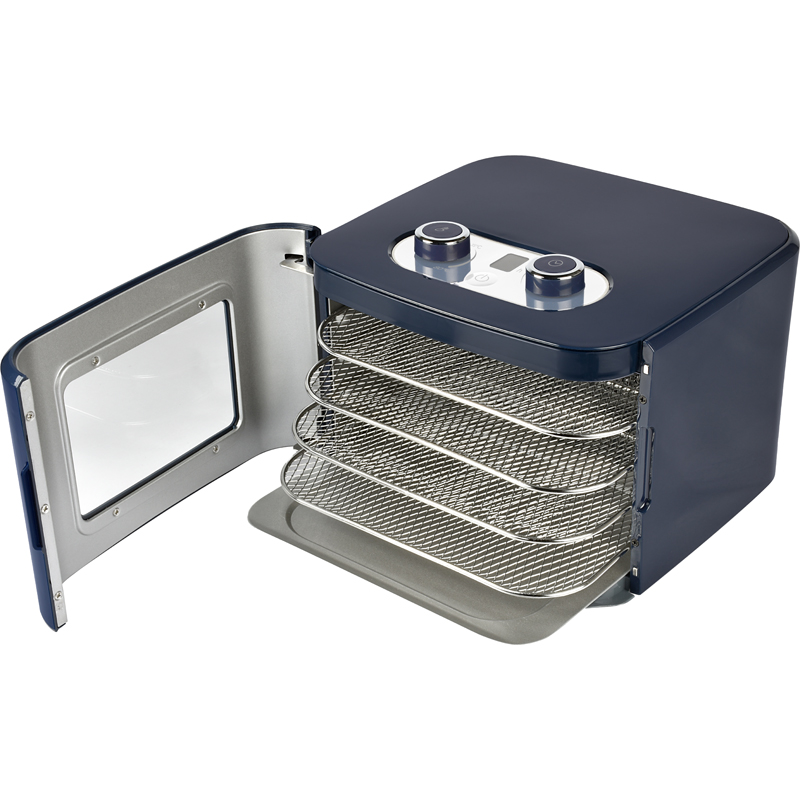 O desidratador utiliza baixa temperatura de 35°C a 80°C, possui display digital e timer regulável de 1 a 24 horas, com desligamento automático. Vem com 4 bandejas de aço inoxidável e uma bandeja para migalhas.