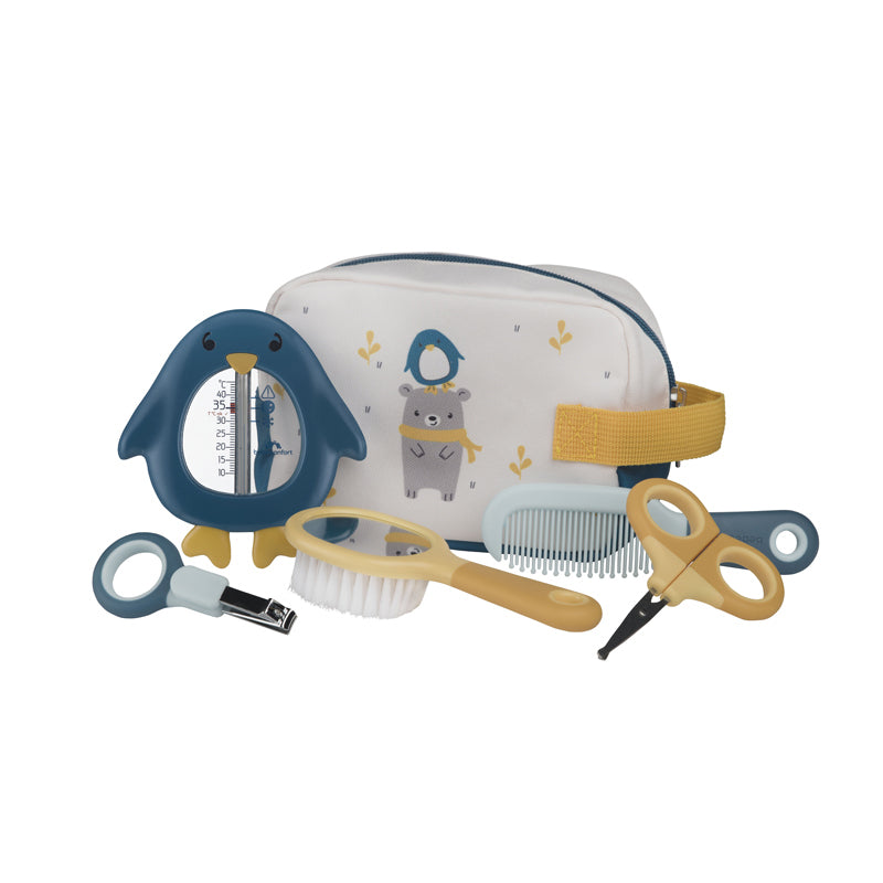 As peças vêm embaladas em um prático estojo de higiene com um design encantador. Seu conteúdo inclui: 1 pente, 1 escova com espelho, 1 corta-unhas na base, 1 tesoura na base e 1 termômetro de banho do personagem pinguim.