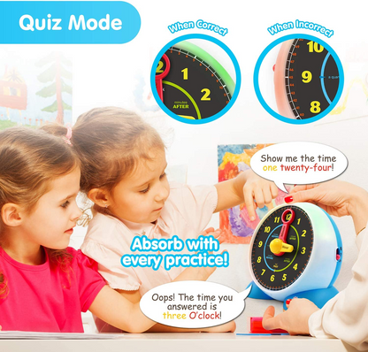 Basta girar os ponteiros das horas e dos minutos conforme ele lê a hora. No Quiz Mode, sua interatividade é essencial para manter as crianças absortas. Ensinar seu filho a ler o relógio nunca foi tão fácil com este Relógio de Aprendizagem.