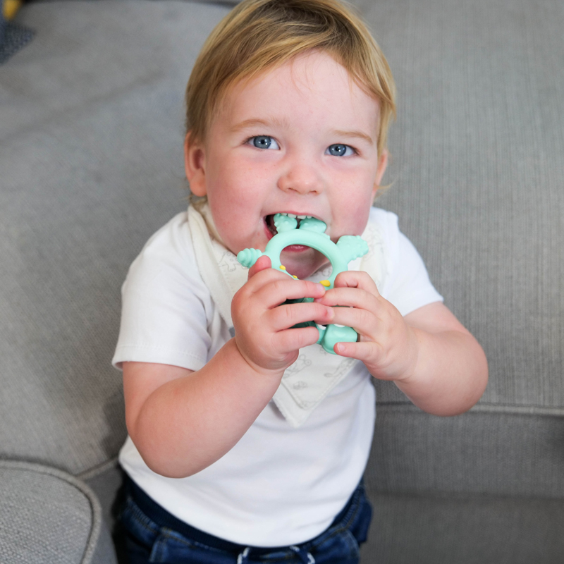 - Dawn foi projetado especialmente para mãos curiosas e é fácil de pegar. O anel multi-grip é perfeito para alcançar, agarrar e segurar. Um aperto de uma a duas mãos ajuda os pequenos a aprender como trazer objetos à vista e até o rosto - a habilidade fundamental de auto-alimentação. Seu caráter envolvente e sabor sutil de menta ajudam a promover o apego e o uso regular. Cinco texturas únicas oferecem oportunidades infinitas para os bebês explorarem. Cada parte do Dawn se concentra nas diferentes ações necessárias para uma alimentação bem-sucedida - incluindo movimentos laterais da língua, mastigação frontal e posterior da boca, desenvolvimento dos músculos dos lábios e deglutição segura. Há um cheiro sutil de menta também!