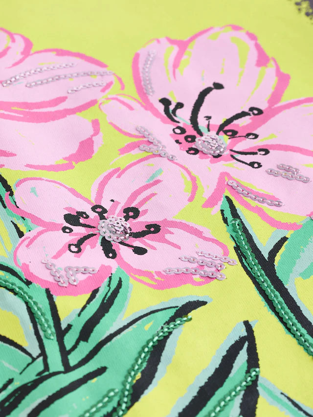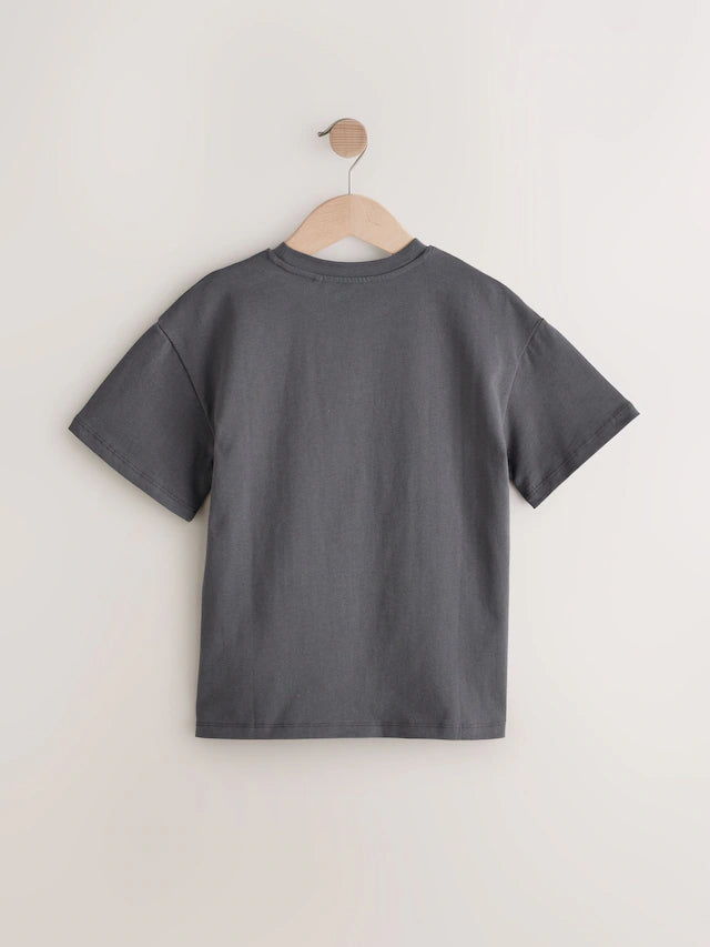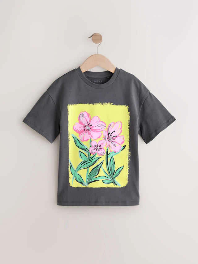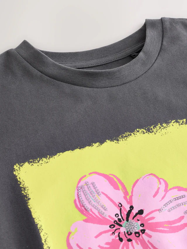 |BigGirl| Camiseta Grande Com Estampa De Flor De Lantejoulas Cinza Carvão 100% Algodão (3 a 16 anos)