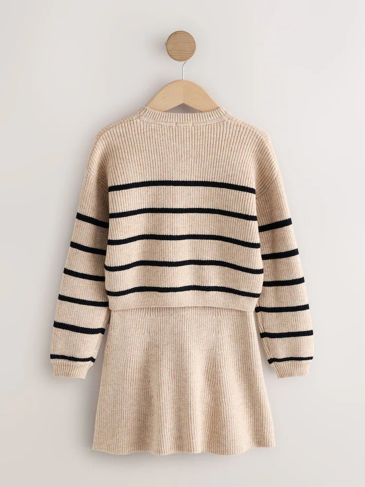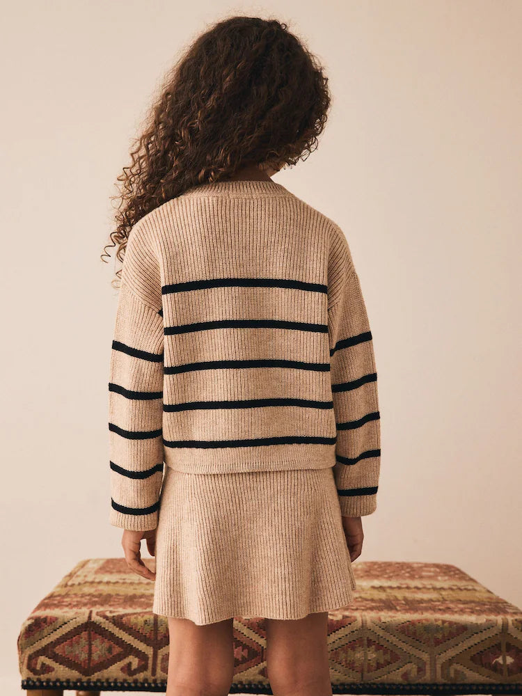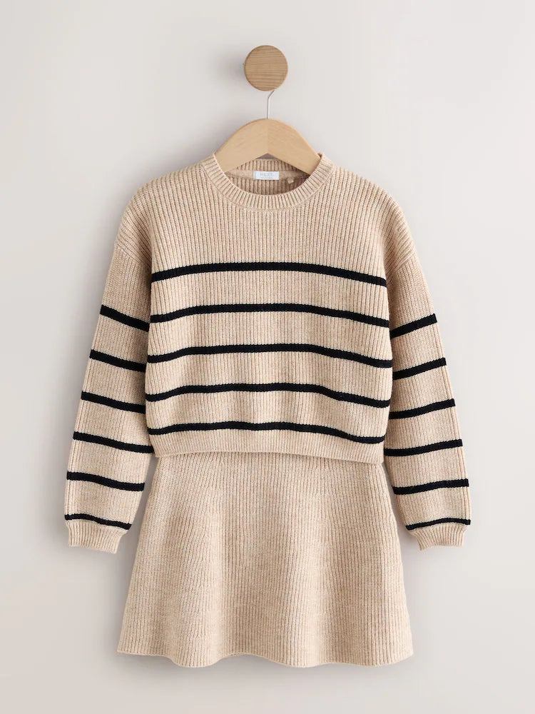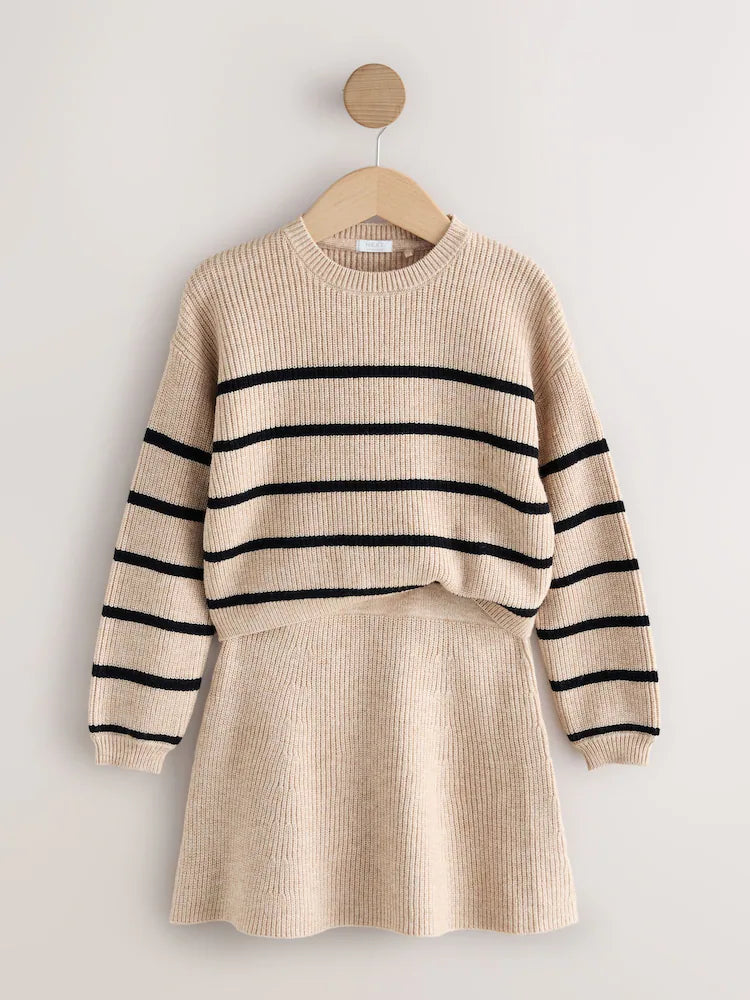 |BigGirl| Conjunto De Suéter e Saia Listrados Em Malha Marrom Bege (3-16 anos)