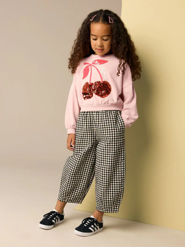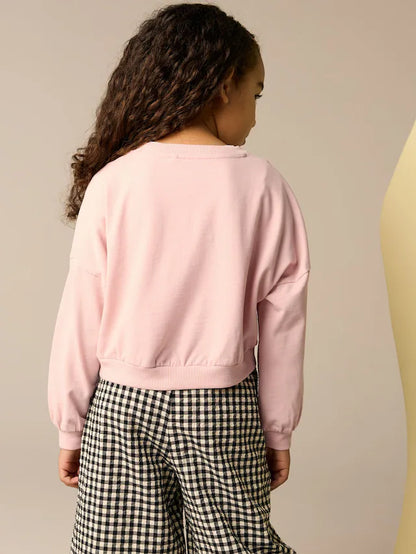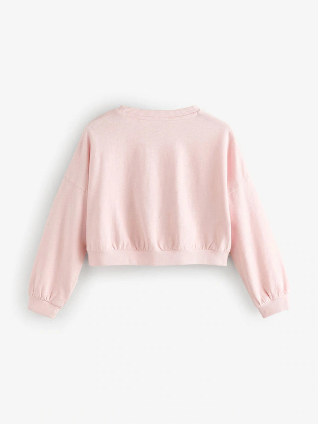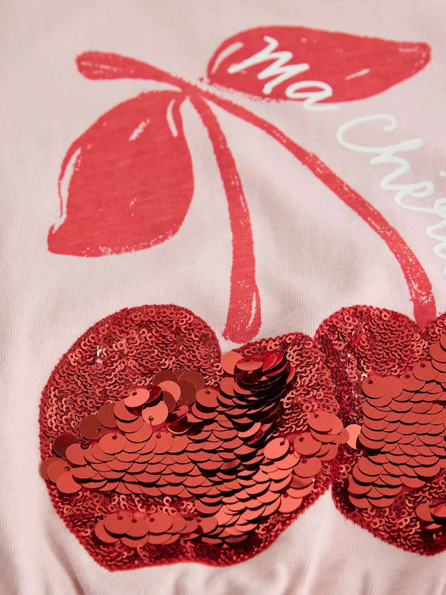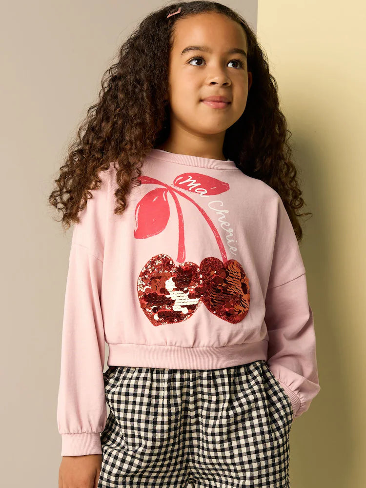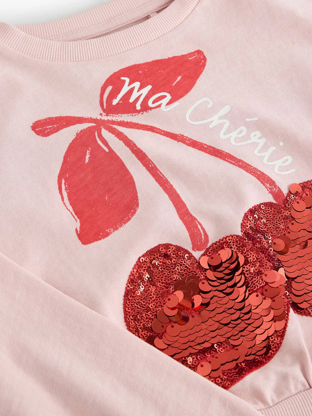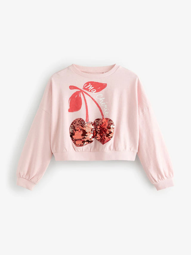|BigGirl| Moletom Rosa Lantejoulas Cereja Boxy Manga Comprida 100% Algodão (3-16 anos)