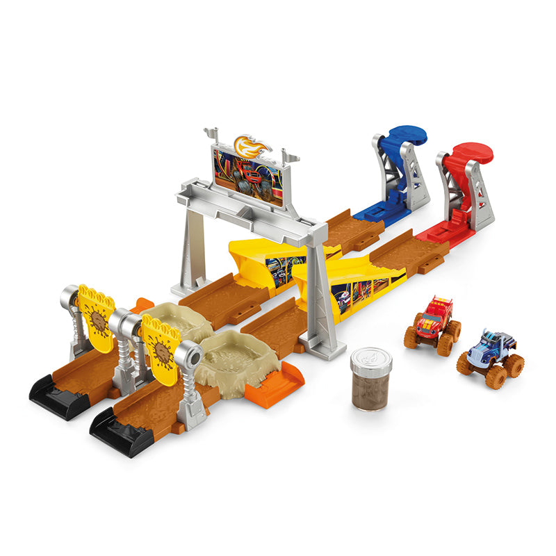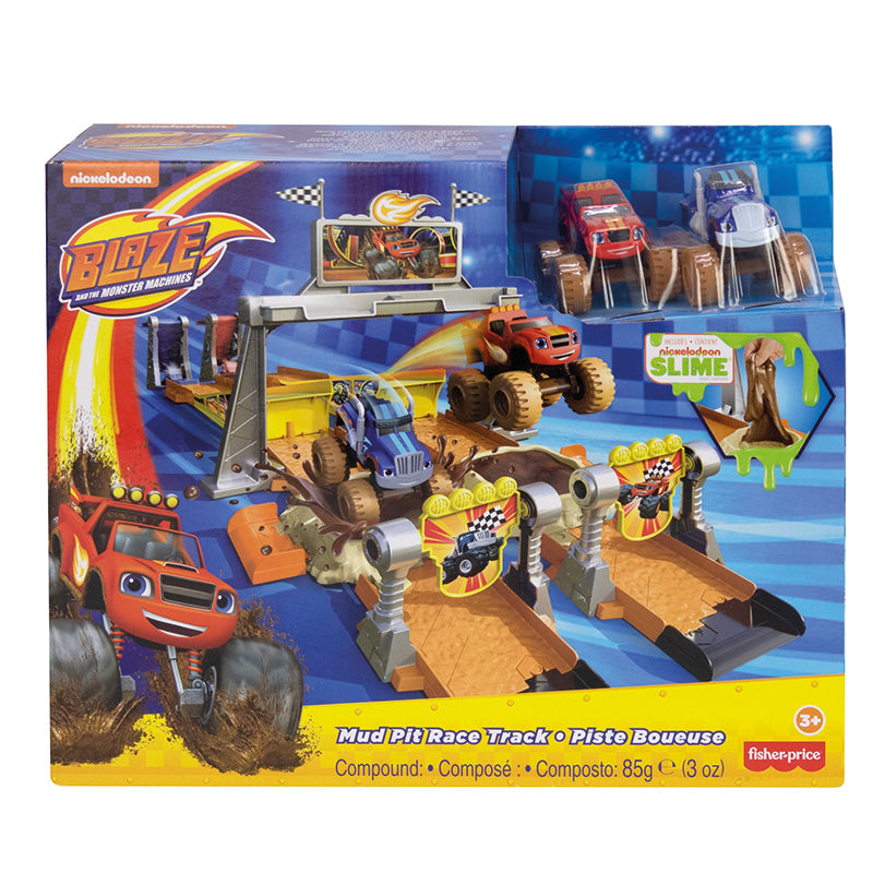 Em sua marca, prepare-se, vá! As crianças podem jogar Blaze e Crusher competindo um contra o outro com o Blaze e o Monster Machines Mud Pit Race Track da Fisher-Price.