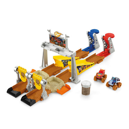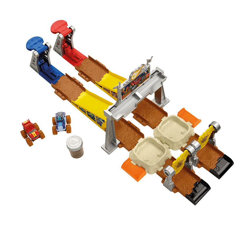 Este conjunto de veículos de alta octanagem apresenta várias configurações, composto da marca Nickelodeon Slime reutilizável e dois lançadores para enviar os monster trucks para frente, sobre as rampas e voando pelo ar sobre os poços de lama imundos.