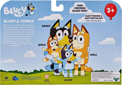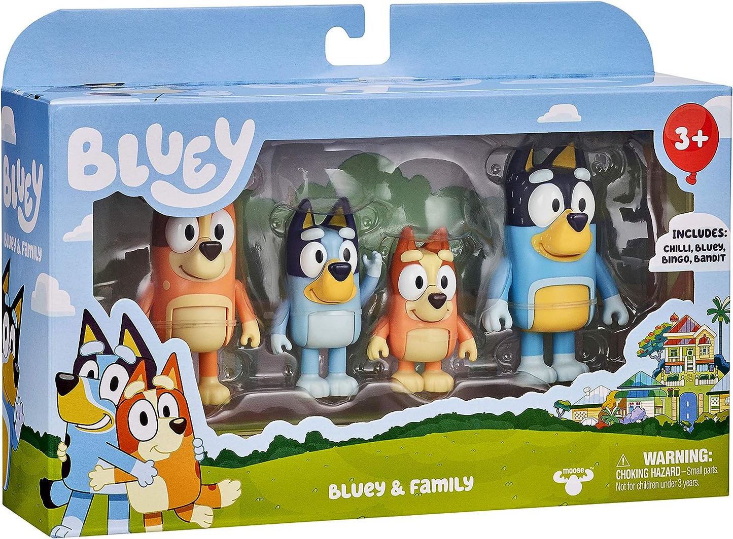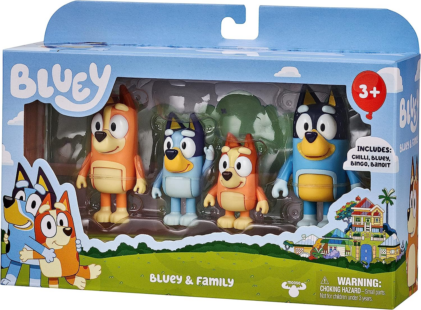 - O pacote familiar Bluey inclui figuras de Bluey, irmã mais nova Bingo, pai Bandit e Mum Chilli