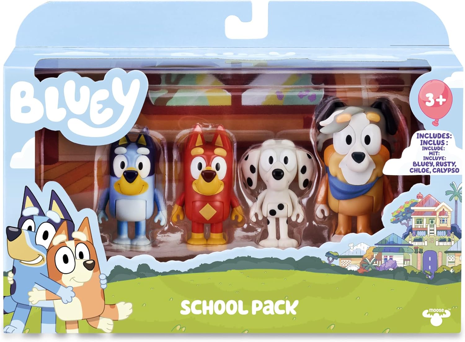 - Este pacote escolar de 4 figuras de Bluey contém 4 personagens, incluindo Bluey, como seus colegas Chloe e Rusty e seu professor da escola Calypso